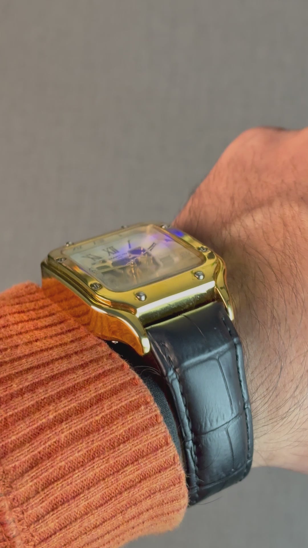 Elegant square-shaped case with refined edges, offering a bold yet classic presence on the wrist. -